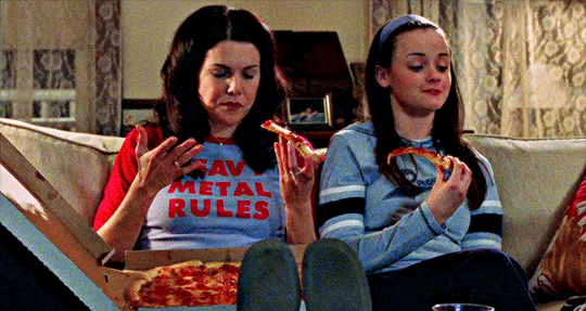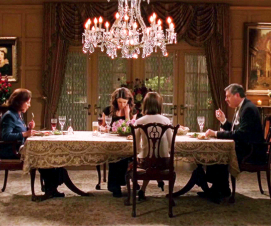 Характерных для сериала атрибутов великое множество. Можно с легкостью составить вокабуляр «Девочек Гилмор» и структурировать вселенную шоу, тщательно сотканную авторами. Эми Шерман-Палладино создала осязаемый мир, в котором хочется изучить каждую деталь и задержаться подольше. Если любимый напиток Лорелай и Рори кофе, то любимая еда — любая, которая не требует готовки. Кухня Гилмор предназначена не для кулинарных экспериментов, а для вечерних трапез из доставки. Сложно вспомнить другой сериал, в котором женщины настолько обожали бы еду и с упоением наслаждались фастфудом. Окружающие то и дело впадают в ступор от способности Гилмор есть так много за раз: Лорелай и Рори регулярно устраивают пиры и удобно располагаются перед телевизором с огромным количеством вредной еды. Разумеется, героини не занимаются спортом и при этом остаются стройными (семейный дар или магия кино?).