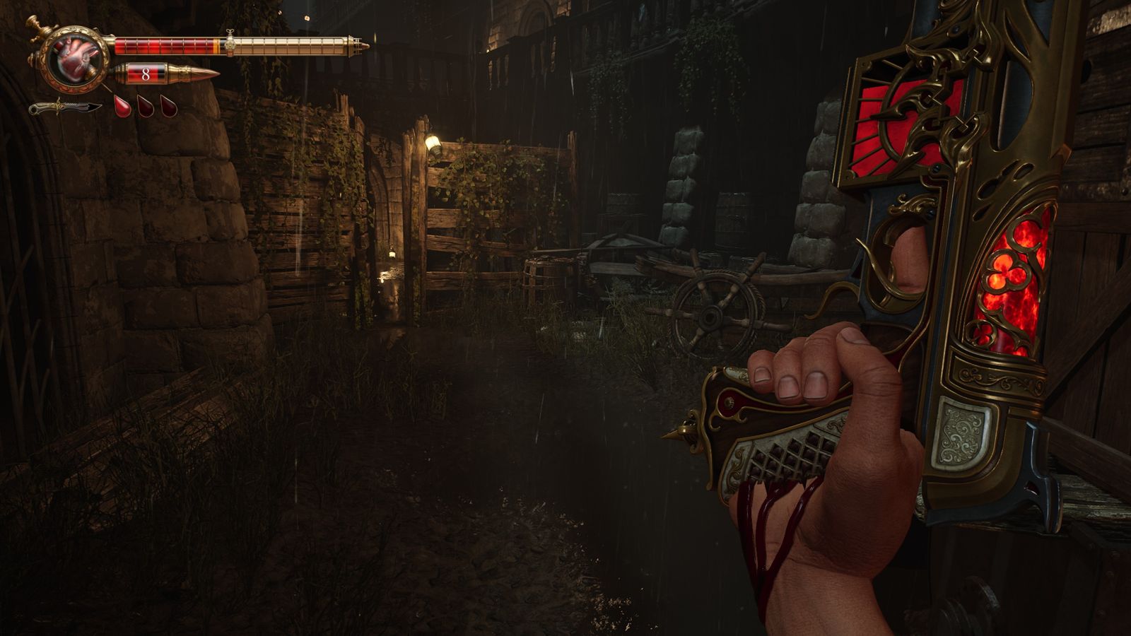 Вскоре Габриэль получает возможность сражаться, и здесь-то наконец раскрывается главная фишка Crisol: вместо патронов игра использует кровь героя, поэтому полоска здоровья нужна еще и для пополнения боезапаса. Идея на бумаге звучит интересно и должна подталкивать геймеров к непростым решениям о том, нужно ли в моменте держать полную обойму пистолета или лучше сохранить драгоценную кровь для того, чтобы подольше выжить. Восполнять здоровье приходится необычными методами — через поглощение мертвых животных, раскиданных по улицам Торментосы, плюс можно носить с собой шприцы с составом, восполняющим кровь.