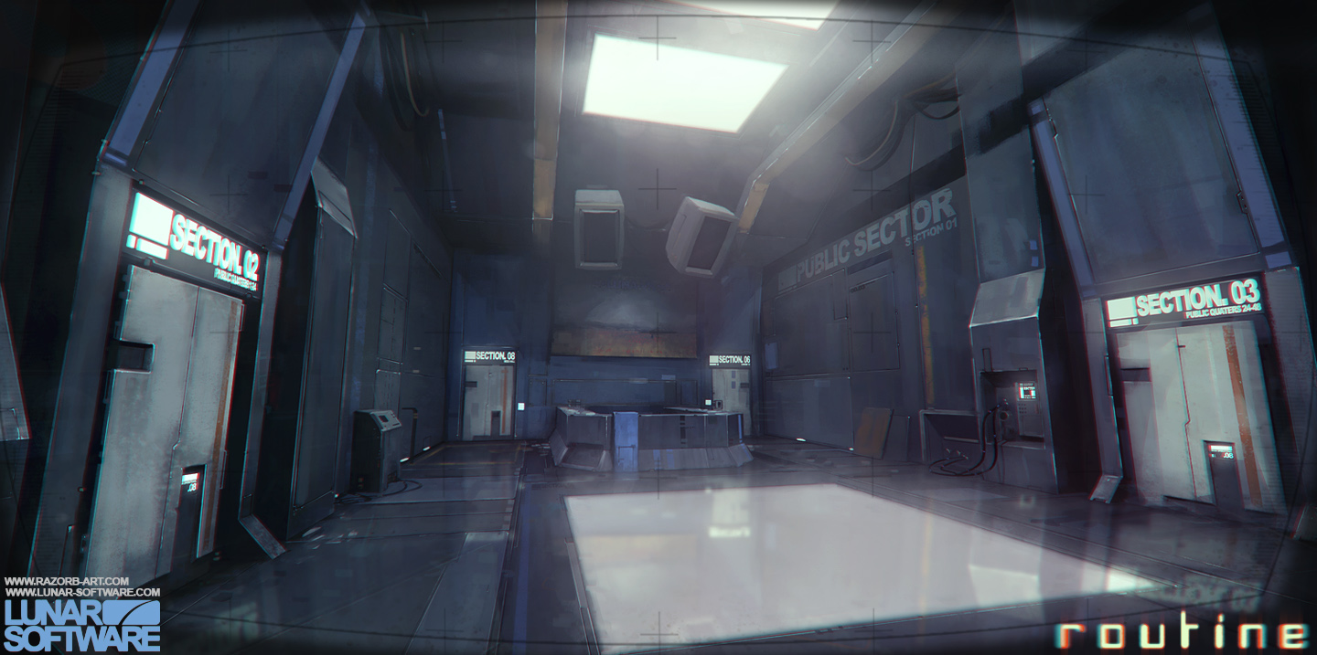 Анонс Routine состоялся в 2012 году, однако разработка стартовала еще в 2008-м. Тогда это был пет-проект Аарона Фостера, недавно выпустившегося из университета амбициозного дизайнера с четким видением. Он всегда вдохновлялся научной фантастикой 1970-1980-х и решил перенести эту любовь в формат видеоигры. Первая версия, скриншоты которой были опубликованы на портале ModDB, была, по сути, симулятором ходьбы: в ней почти не было взаимодействия с окружающим миром, зато уже вырисовывался уникальный визуальный облик. Публикация скриншотов на ряде площадок помогла Фостеру найти еще двух энтузиастов, Джемму Хьюз и Пита Дисслера, с которыми он и основал Lunar Software. Офисом стала комната в квартире, снятой на общие деньги. Как признавался дизайнер, он не особо мечтал заработать на игре — скорее просто хотел реализовать то, что не давало ему покоя.